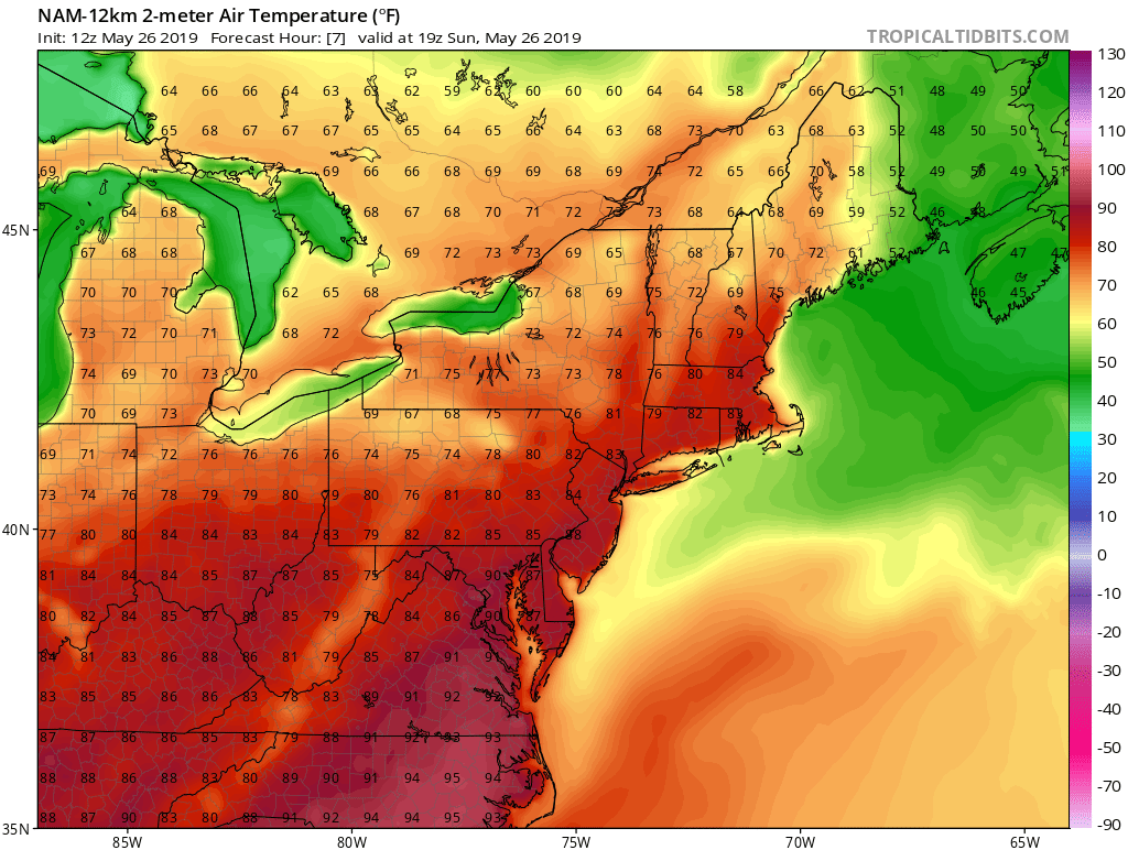 High temperatures will maximize right along I-95 ahead of the cold front.