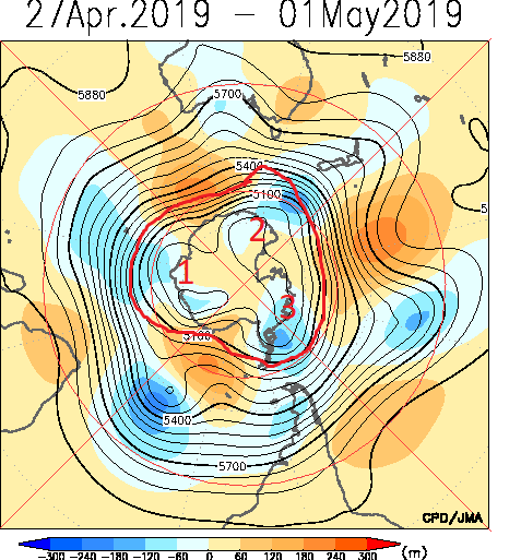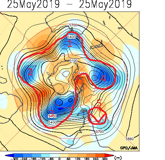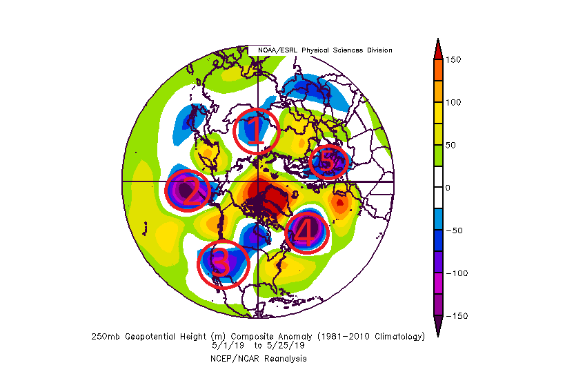 Heading further north, we have seen a strong disruption to the Arctic Oscillation over the entire month of May. There is very strong anomalous HP sitting over the North Pole. After that we see wave number 5 pattern (initially wave number 2 pattern). This suggests more active weather, we have more longwave troughs available to create problems.