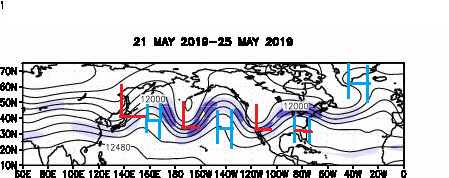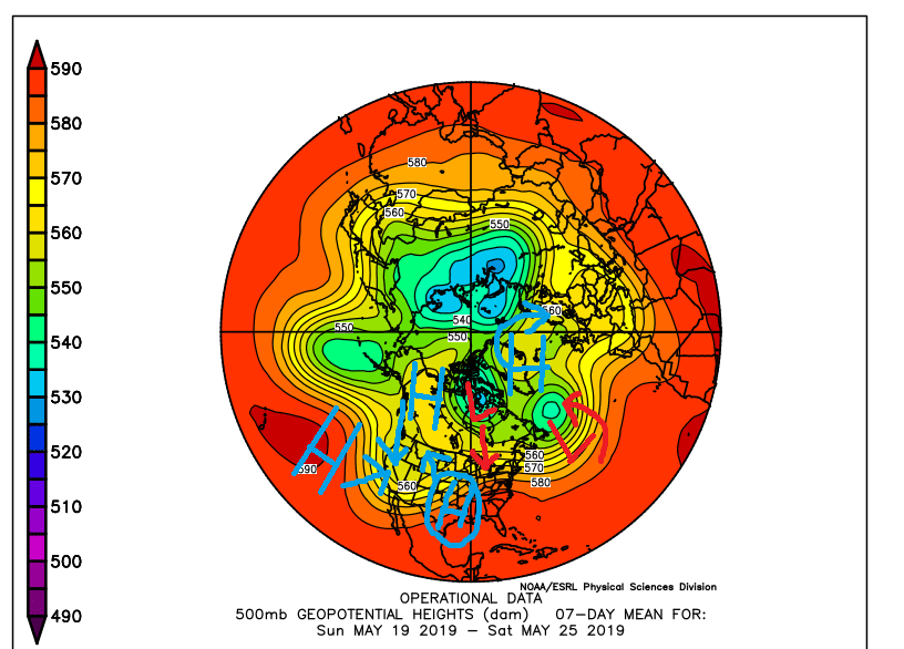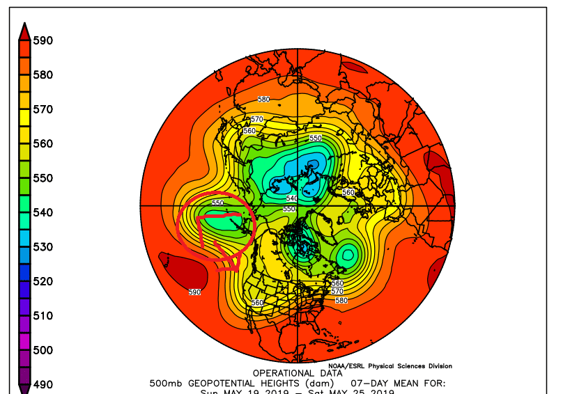 500 mb height anomalies 1st half of May showed huge -NAO anomalies west of Greenland. Southern Canada had strong low pressure anomalies. Out towards the west coast, a split flow pattern was evident with HP anomalies off the coast and LP anomalies extending from the E. Pac around 30N into the SW US.