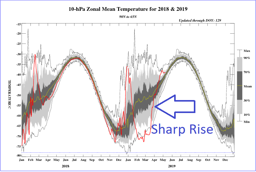 Huge warming event helped to shift the Arctic Oscillation. Prior to this the Arctic was dominated by the Polar Vortex. Yes THEE polar vortex (oh the horror!). Except it is supposed to be there! And then poof, it got warm real fast and the polar vortex was vanquished. This happens every year in the spring. It’s called the “Final Warming”. And after it, we see high pressure take over for a bit. And from the maps above, especially image #3 where the viewpoint is from the Arctic, you can see HP anomalies presiding this month.