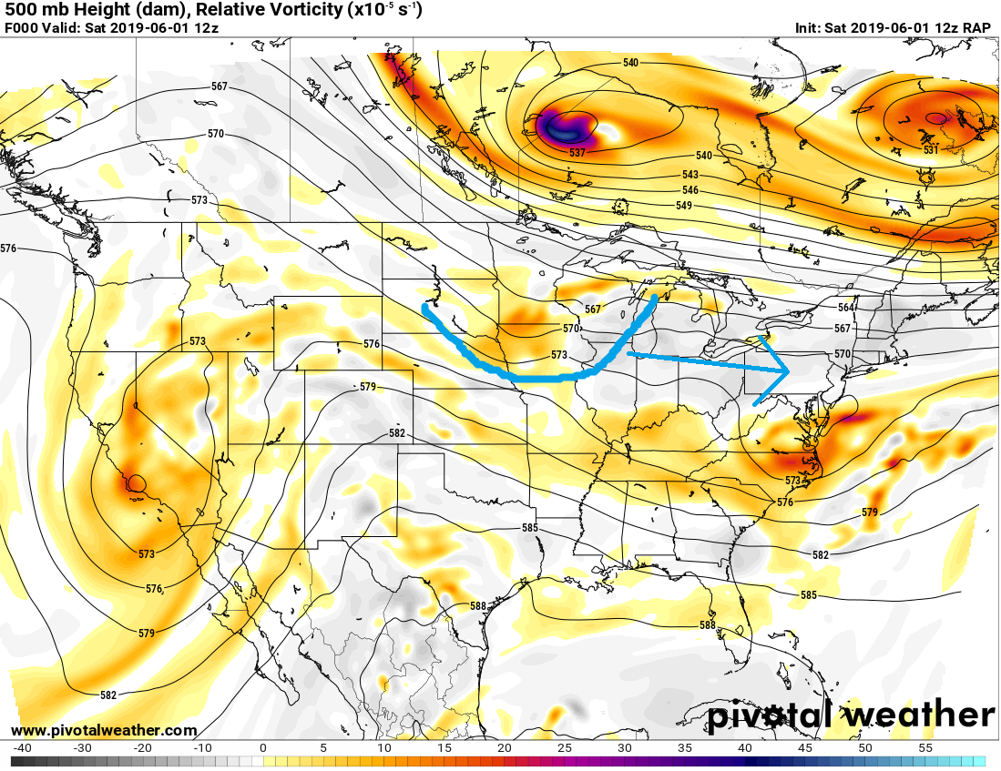 Current RAP analysis of the 500mb shows shortwave trough axis making its way down from Canada. It will be here tomorrow and that will increase our chances of seeing thunderstorms.
