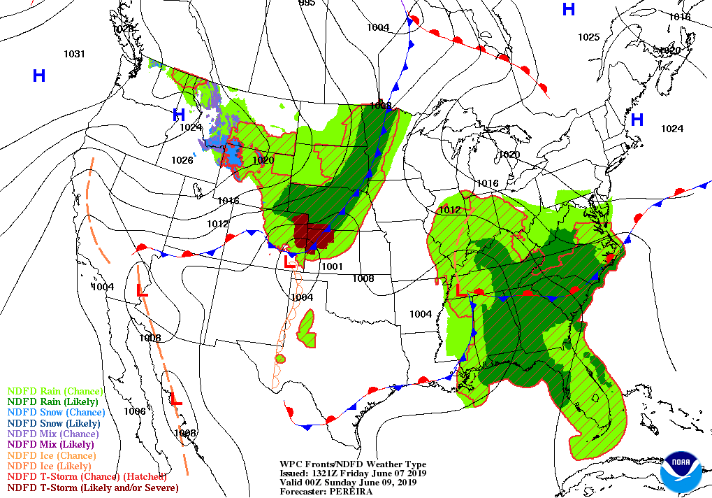 Tomorrow surface pressure map indicates the slow meander. There is also another area of low pressure marching east from the Rockies and Southern Canada.