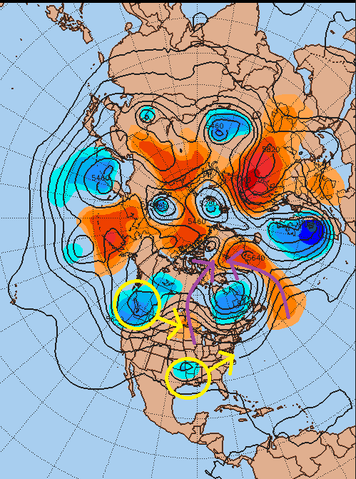 And our big players of course are low pressure areas (highlighted in yellow). Purple are high pressure areas that will ascend over E. Canada/Greenland and punch of low pressure area over Nova Scotia leading to a backup of flow and slow moving rain systems.