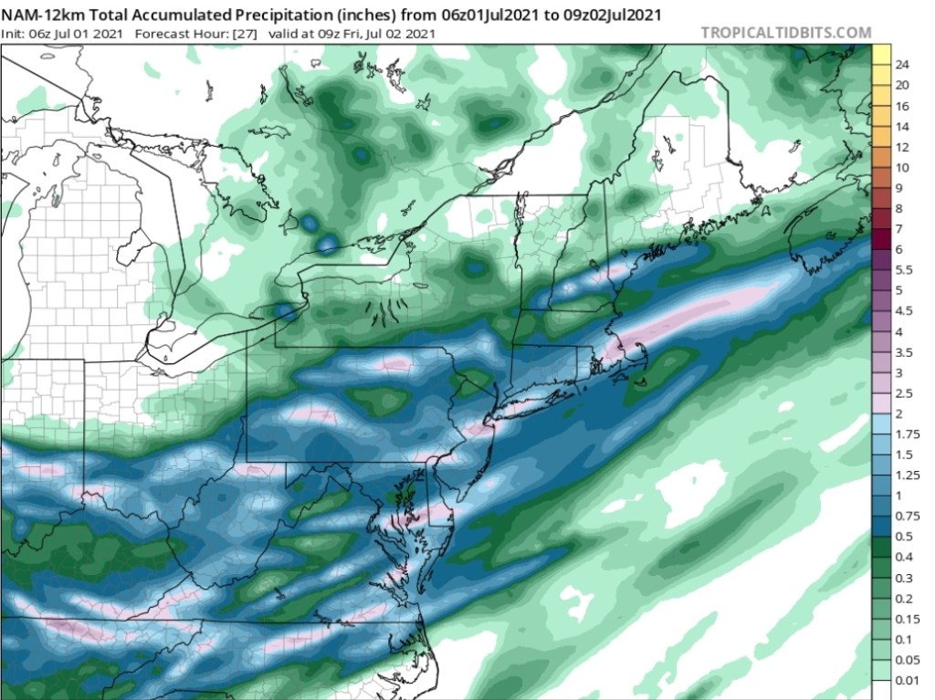 Most of the rain occurs in the afternoon. NAM suggests 1-2″ of rain for CNJ.