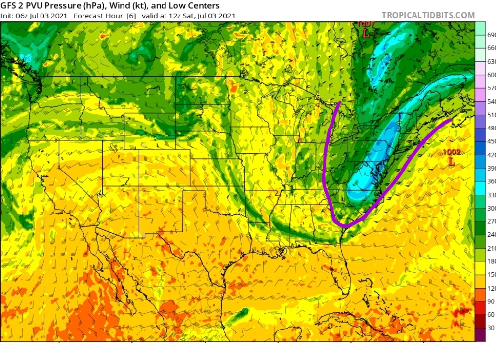 GFS dynamic tropopause shows the upper level low well as. We are under an area of fast upper level winds and tropopause temperatures indicative of polar/cold air. This cold upper level air will help destabilize the atmosphere if we get warm sun.