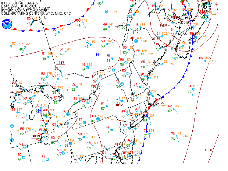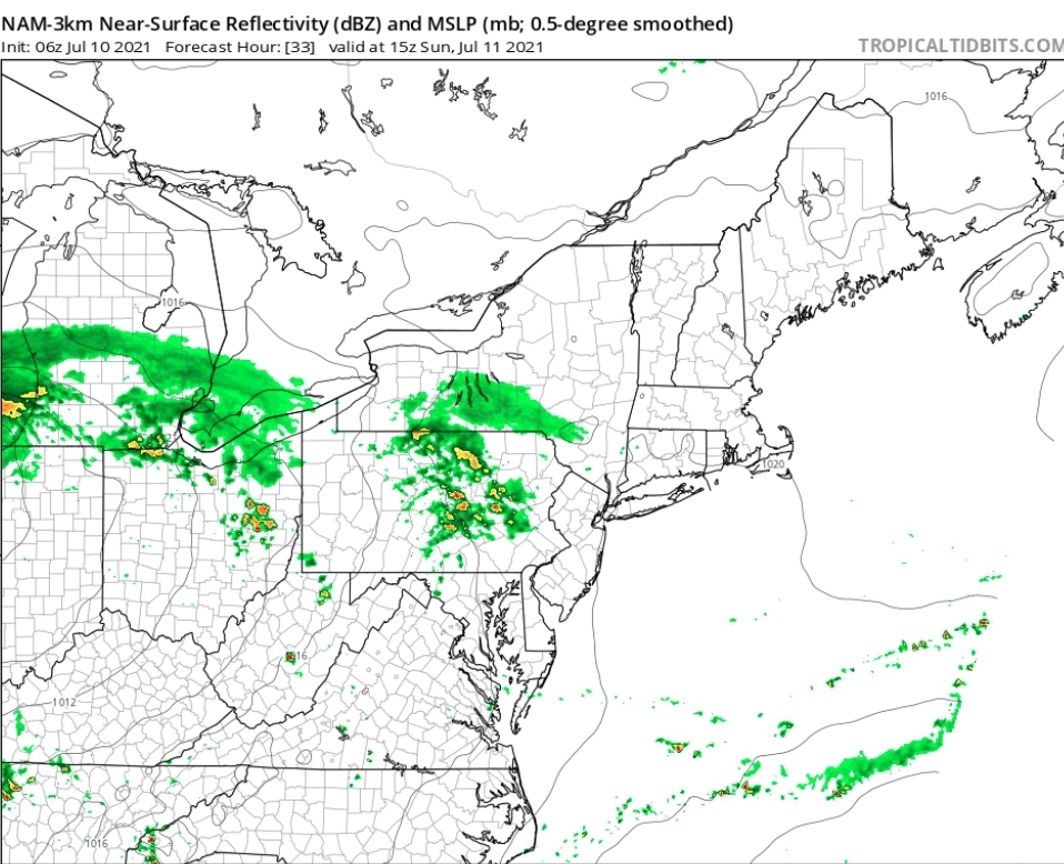As previously mentioned, there is a weak disturbance still to the north. This will slide southward during the day, introducing a chance for isolated thunderstorms, mainly in Northern and Central NJ. NAM depicts a cluster of storms in the image below. There isn’t a lot of upper level winds, so they could sit and dump a lot of rain in one area.