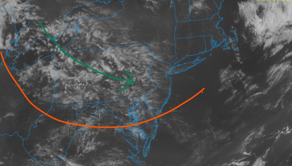 Currently on satellite we can see the trough has pushed south, but its a fairly deep and elongated trough. We are seeing some clouds streaming overhead from the northwest underneath the broad upper level trough.