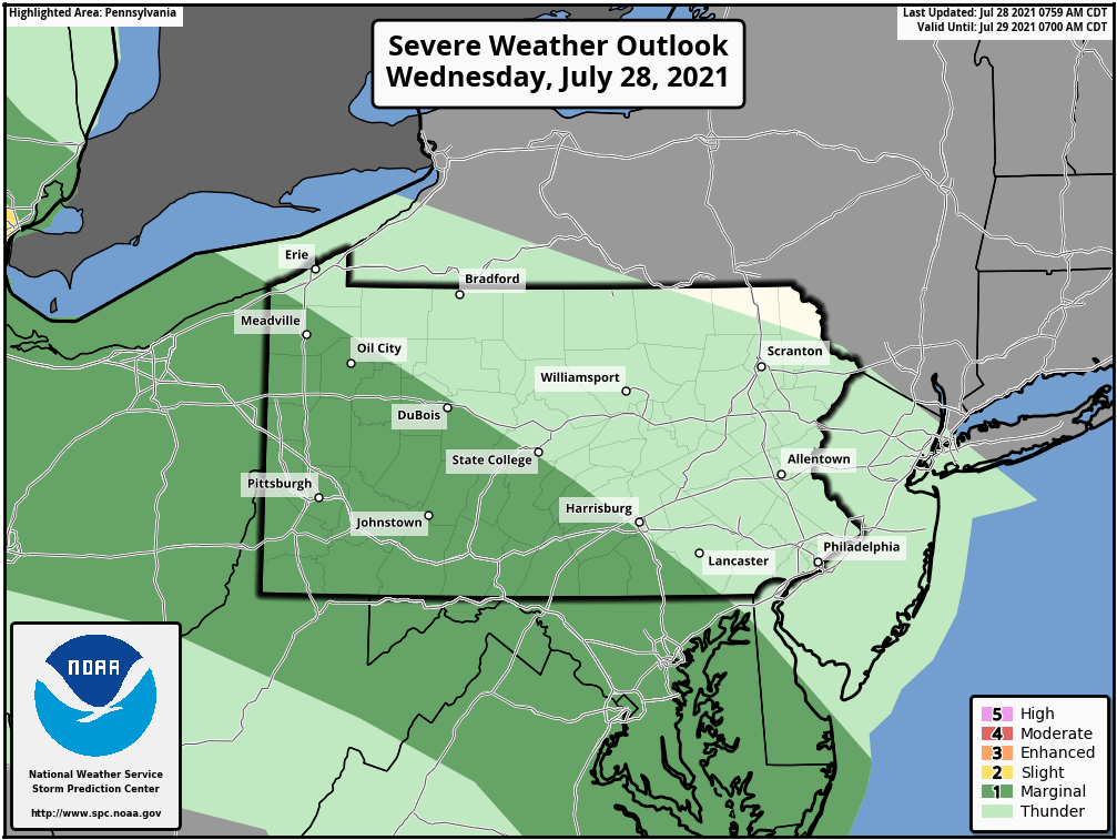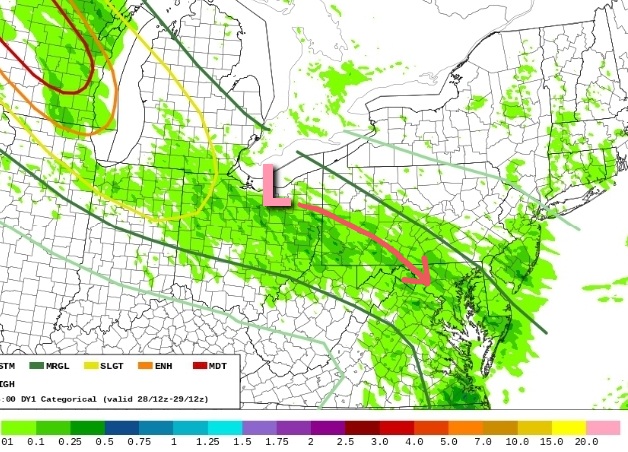 This low pressure will continue southeast into W. PA today touching off a chance of storms this afternoon and evening