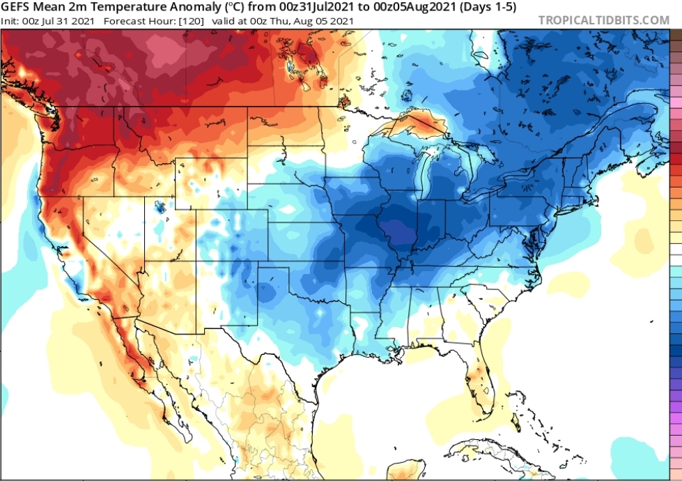 Model ensembles showing cooler week ahead. This should mean high temperatures in the low 80s for this time of year. At the very least we aren’t going to torch. There is a deep trough bringing in cooler weather to the Eastern seaboard while the W US bakes.