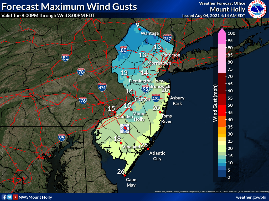 A little breezy along the shore. Could gust up to 25-30mph. There is a rip current risk for today as well if you are down at the beach.