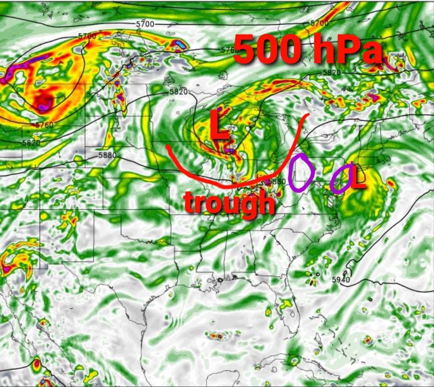 Most of the action is coming from the upper levels of the atmosphere. Here we take a look at 500mb (15000 ft) and see a small closed circulation on Long Island which will enhance cyclonic flow in E PA and NJ this evening, which I highlighted in purple. Towards the Great Lakes and Ohio Valley is a mid-level trough and that will result in showers and storms for W. PA later this evening.