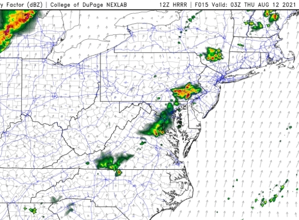Models different in placement of the storms. NAM this morning has stronger storms coming into C. PA and dissipating in the evening as they push east. HRRR below has some of those strong storms making it to the city. Map courtesy of College of DuPage.