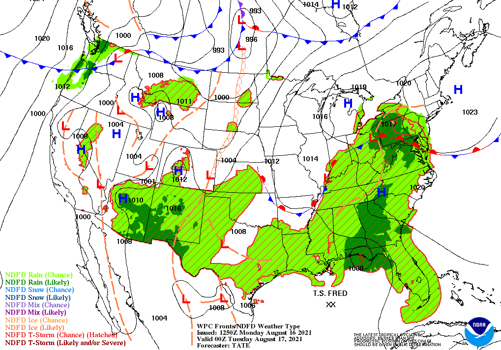 Rain chances increase tomorrow as the remnants of Fred push north towards the area. Best chance of heavy rain will be Wednesday (not pictured).