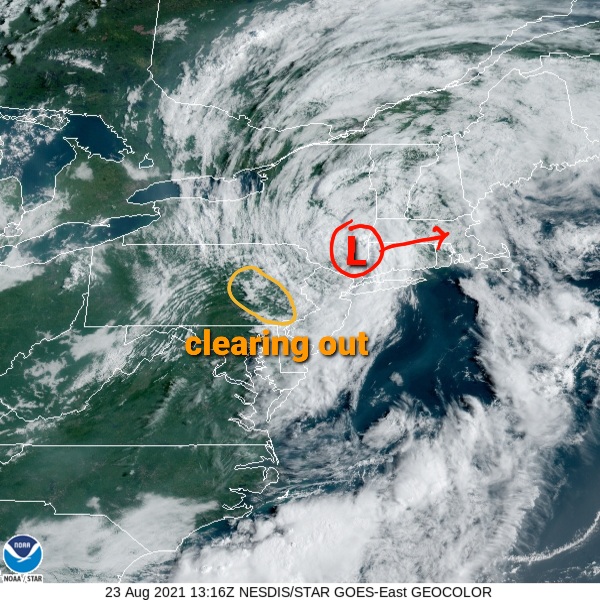 On satellite you can also see the center of circulation pretty clearly. There is some clearing out to the west, so some sun is expected today which can trigger some storms before Henri departs.
