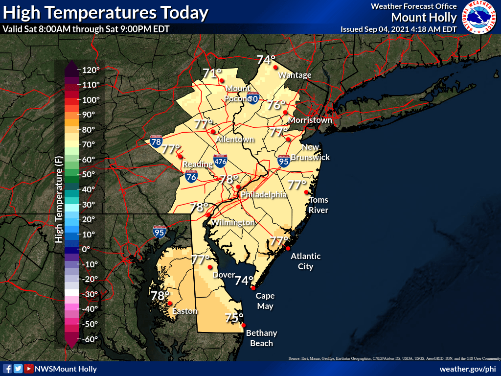 Most of the area today will be in the mod to upper 70s. Comfortable with low dews. The early mornings have a fall crisp in the air as we wake up with temps in the 50s.