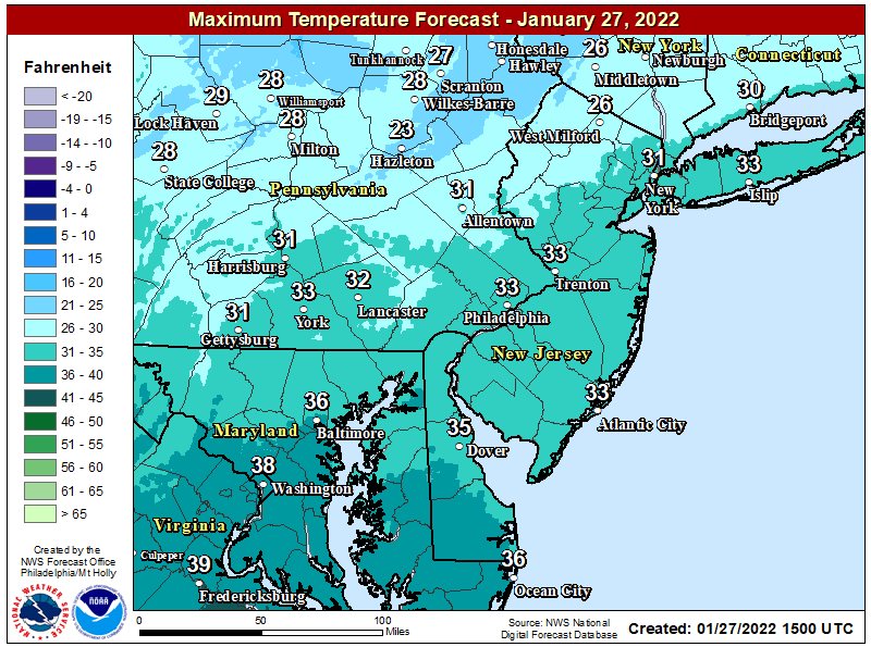 Highs in the low 30s in the city all the way into the immediate burbs. 20s up in the mountains.