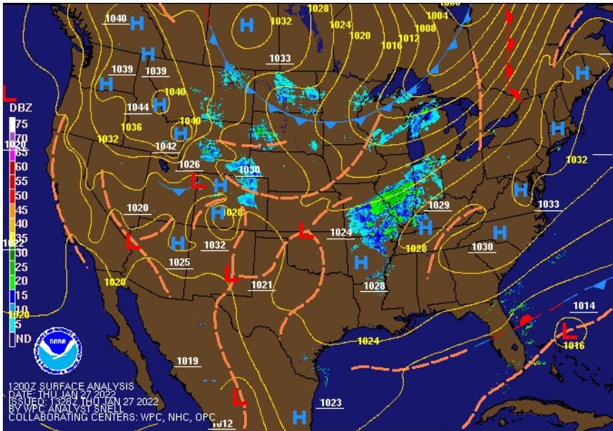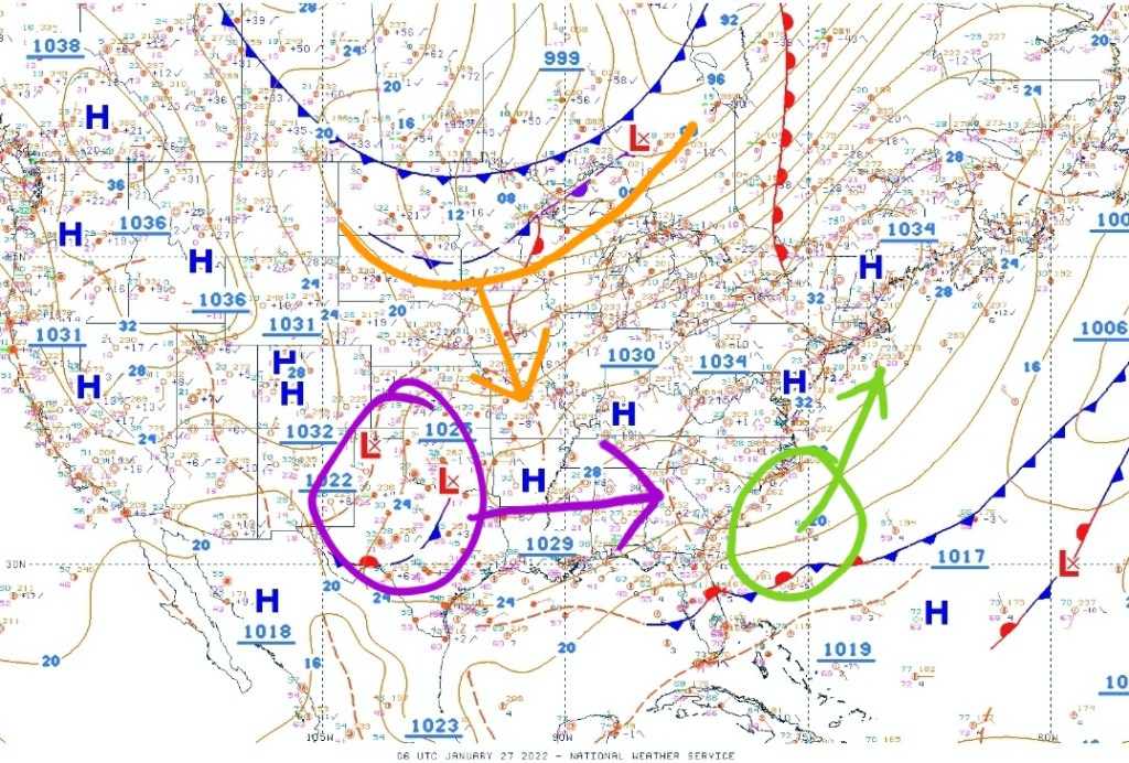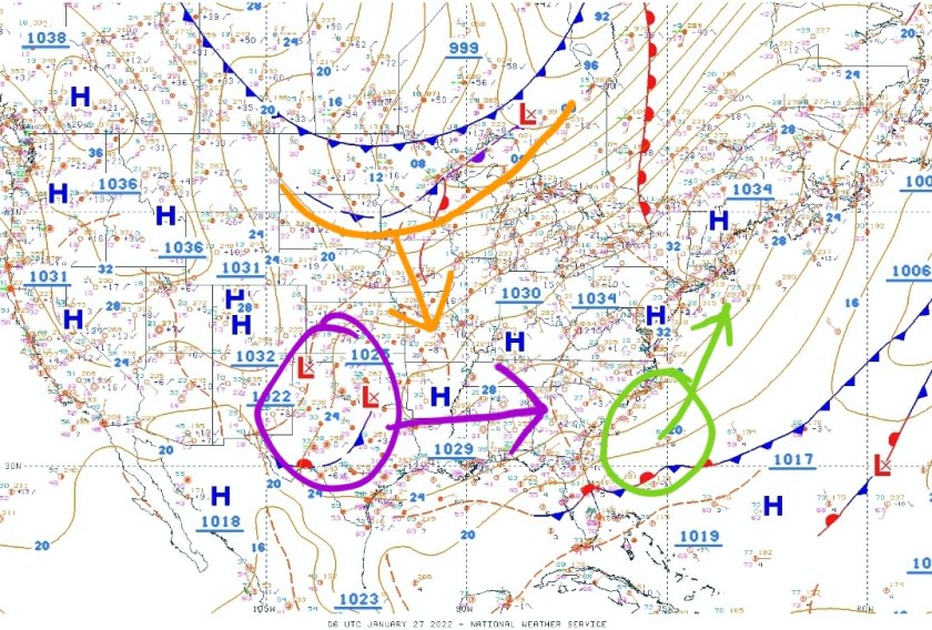 If we strip away the radar, we can see some early features of the big winter storm coming together. We have some low pressure areas in the SW US, cold front dropping from the Plains, and these will meet up in the southeast to form our storm. That’s an Arctic front dropping down with very cold temps.