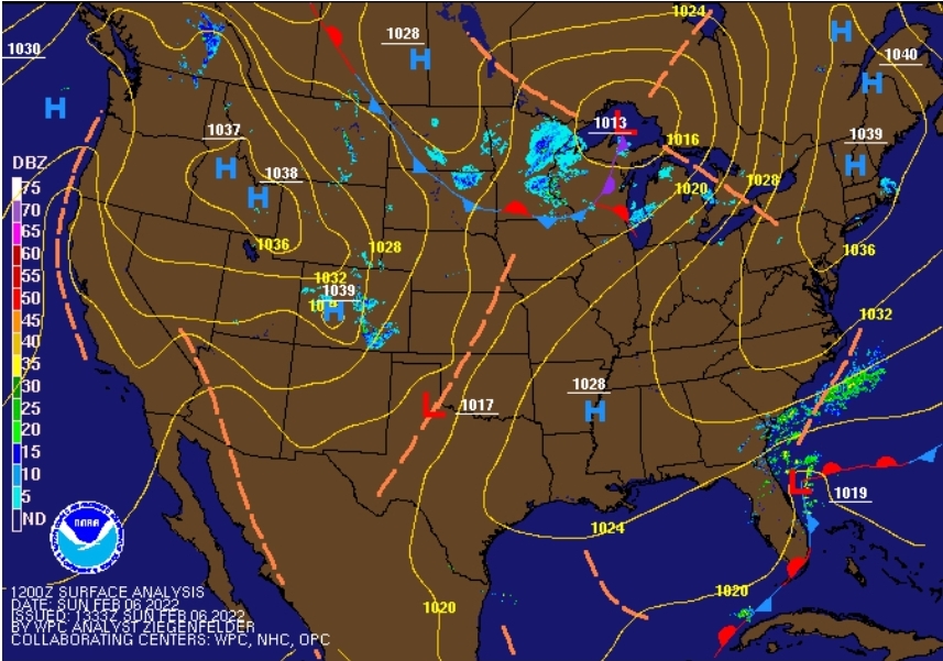 High pressure overhead and sunny skies today. Some clouds move in later on as a small system develops off the southeast coast and tracks northeast.