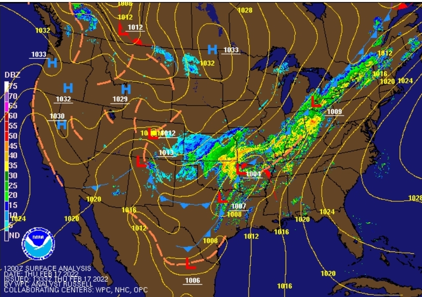 Currently on the surface map we see large area of low pressure extending from the Ohio Valley to the south. This is going to be a slow moving front during the day. Expecting 2″+ of rain towards our west.