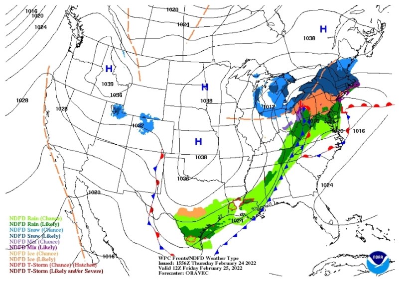 Low pressure developing to our south. This will move to our west with weak surface low developing near the coastline. This will also introduce warm mid-level air, but surface temps may be near freezing tonight and into tomorrow morning that could cause sleet or freezing rain.