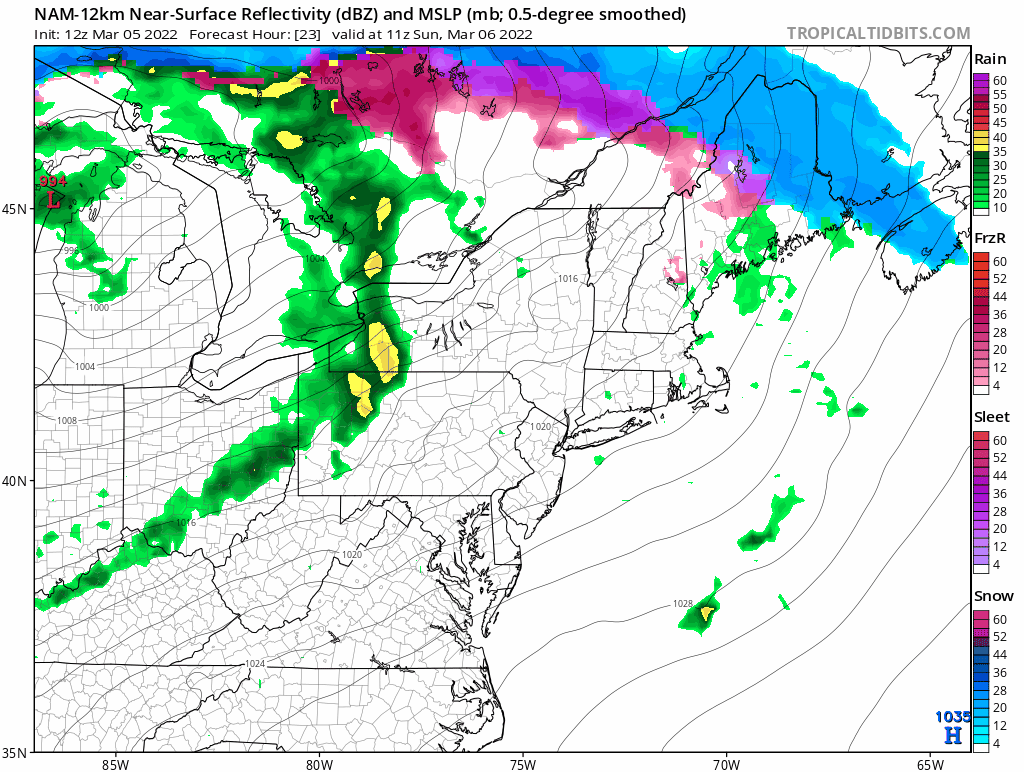 Showers tomorrow morning as the warm front moves through. The rain may keep temps down from reaching 70 degrees.