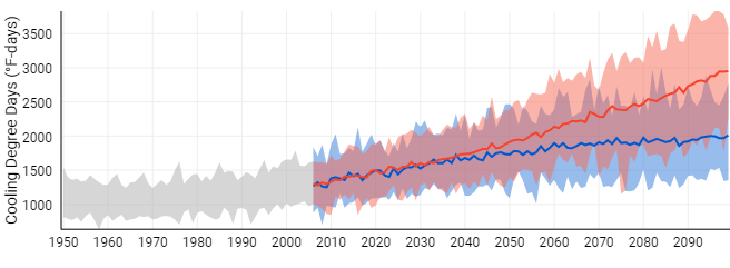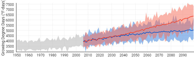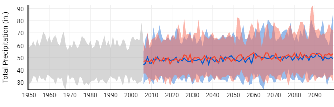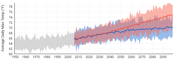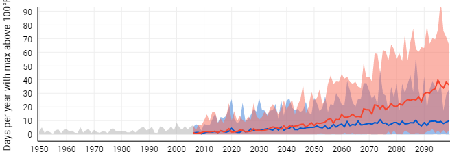 Projections courtesy of Climate Explorer. Red for higher emissions, blue for lower.