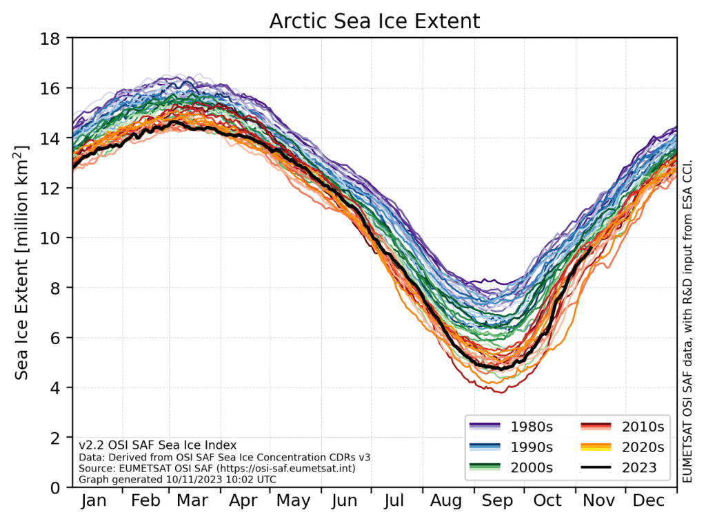 Northern Hemisphere Sea Ice Extent Last 4 Weeks (and yearly comparison)