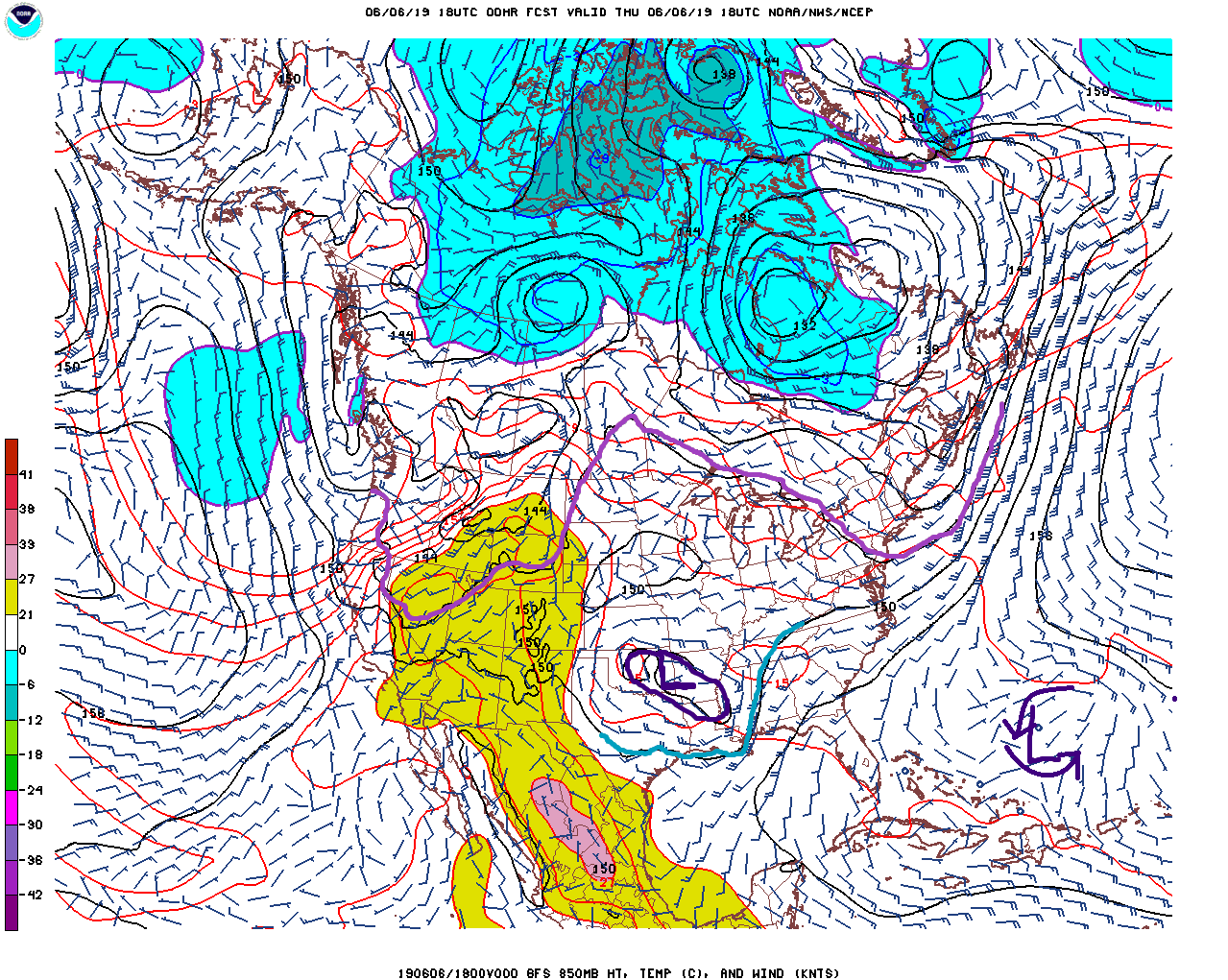 Depending on the website you use, the map can have several features. I have chosen the 850mb heights, temperature, and wind chart provided by the NWS. The forecast models have come a long way. It used to be that you could only get the 500 mb charts, and with that, attempt to discern where your front will set-up and where the action is. In today’s model outputs, everything is right there for you. DAM stands for decameter. So if you want to know the height of the pressure in meters, place a 0 behind the 3 digits on the countours. For example, the 148 dm height contour slices through Philadelphia, Pennsylvania (purple line). If you were standing in Philly and let loose a weather balloon, it would take it approximately 1480 meters to reach a pressure of 850 mb. And the conversion to feet is calculated by multiplying the meters by 3.3.