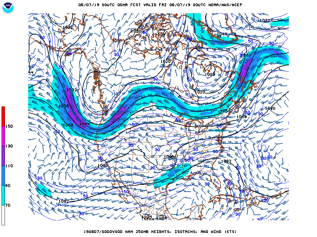 Without getting too technical, the jet streak is divided into 4 quadrants, 2 in the front and 2 in the back. These are further subdivided, 1 is rising air, and one is sinking air, known as divergent and convergent air aloft.