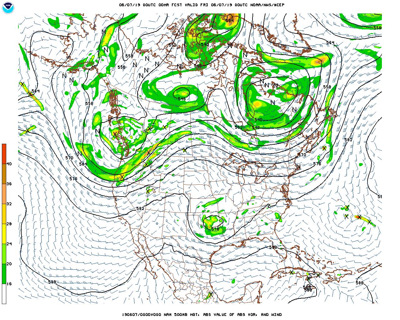 In the above image, we have the 500 mb pressure heights, the vorticity, and the winds. Similar to the 850 mb chart, the heights here are in decameters, so if you place a 0 at the end of the 3 digits you get the height in meters. As you can tell, to reach 500 mb requires you to go much higher than 850 mb of pressure.