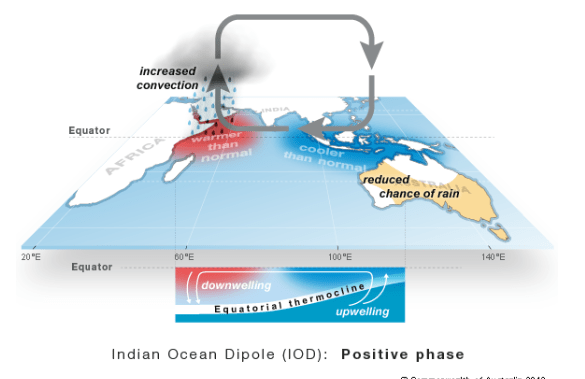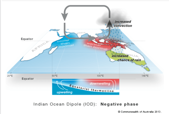 Subsequently, this creates a cascade effect in the Indian Ocean. The Indian Ocean can be monitored in many ways, and one of them is the Indian Ocean Dipole (IOD) which measures SST anomalies. During La-Nina phases, the IOD becomes negative, favoring warmer SSTs near the Western Australian Coast and cooler SSTs near Africa