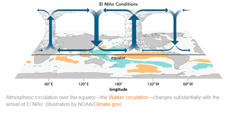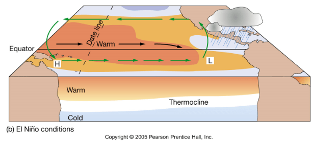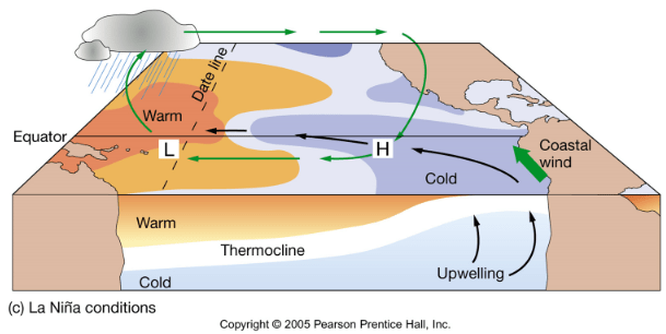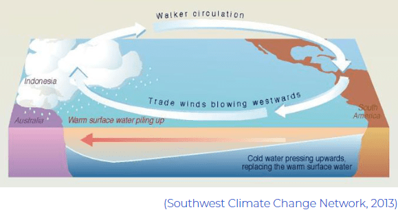 Remember when I said that this is a three-dimensional model. The Walker Cell exists in the upper levels of the atmosphere as well. This, in part, is driven by the pooling warmer water in the West Pacific that leads to increased rain/monsoons. leading to our atmospheric component. Drier air persists along the American coastline and solar radiation warms the water as it continues to be pushed to the Western Pacific.